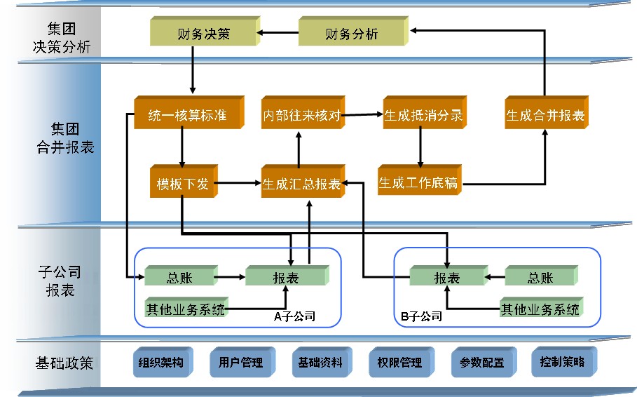 集团(tuán)财务(wù)报告(gào)管理解决方(fāng)案通过多方案合(hé)并策略、多角(jiǎo)色汇报机制,支(zhī)持多层级的(de)集团一次(cì)性平(píng)行合并和(hé)顺序合(hé)并方法(fǎ),满足行(háng)业、组织、地域等(děng)多角度(dù)的合并,支持大陆(lù)会计政策和香港(gǎng)会计政策下的财(cái)务合并,对内(nèi)对外提供经营报告、财务报告、例外事件(jiàn)报告(gào)、经济分析报(bào)告,为CFO提(tí)供最大限度的财务信(xìn)息支撑。