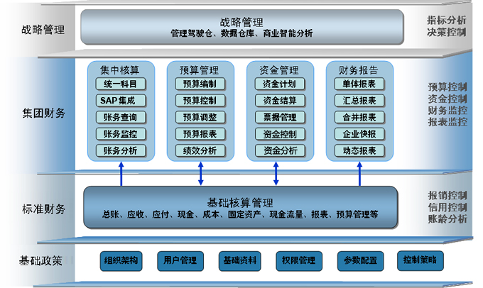 全面的集(jí)团财务管理解(jiě)决(jué)方案,该方案通过对集团财务基础政策、集中核算、预算管理(lǐ)、资金管理、财务报告(gào)、战略管理等核心内容进行统一整合(hé),实现集团财务政策的集中统一,规范财(cái)务(wù)核算,加强全面(miàn)预算管理、集中控制资(zī)金、随时掌(zhǎng)握财(cái)务报告,达到集团资源整合,发挥集团的整(zhěng)体效益,实现(xiàn)企业价值最大化。